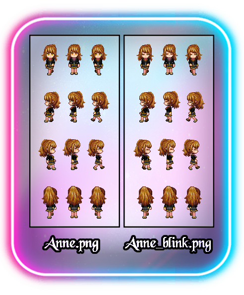 - Each character used must have a blinking version of its sprite with the suffix "_blink". For example: