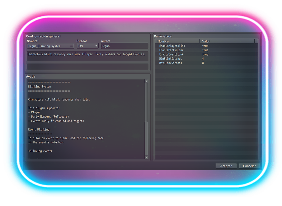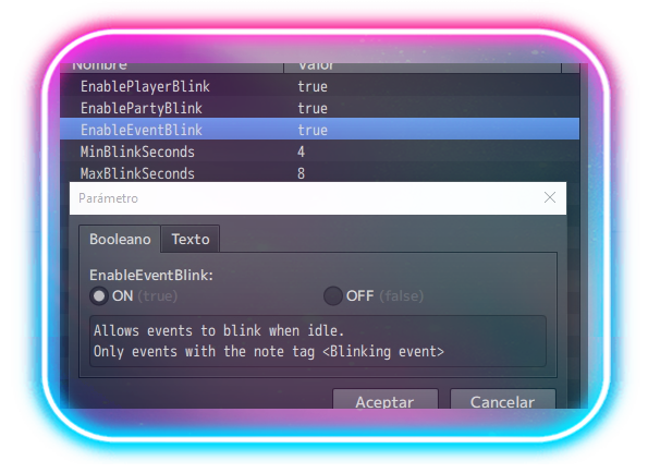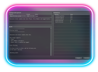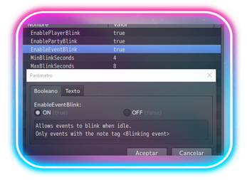 - To allow an event to blink, first you must activate the blinking events at the plugin's settings. Then, to specify wich event is going to blink, add the following note in the event's note box:
